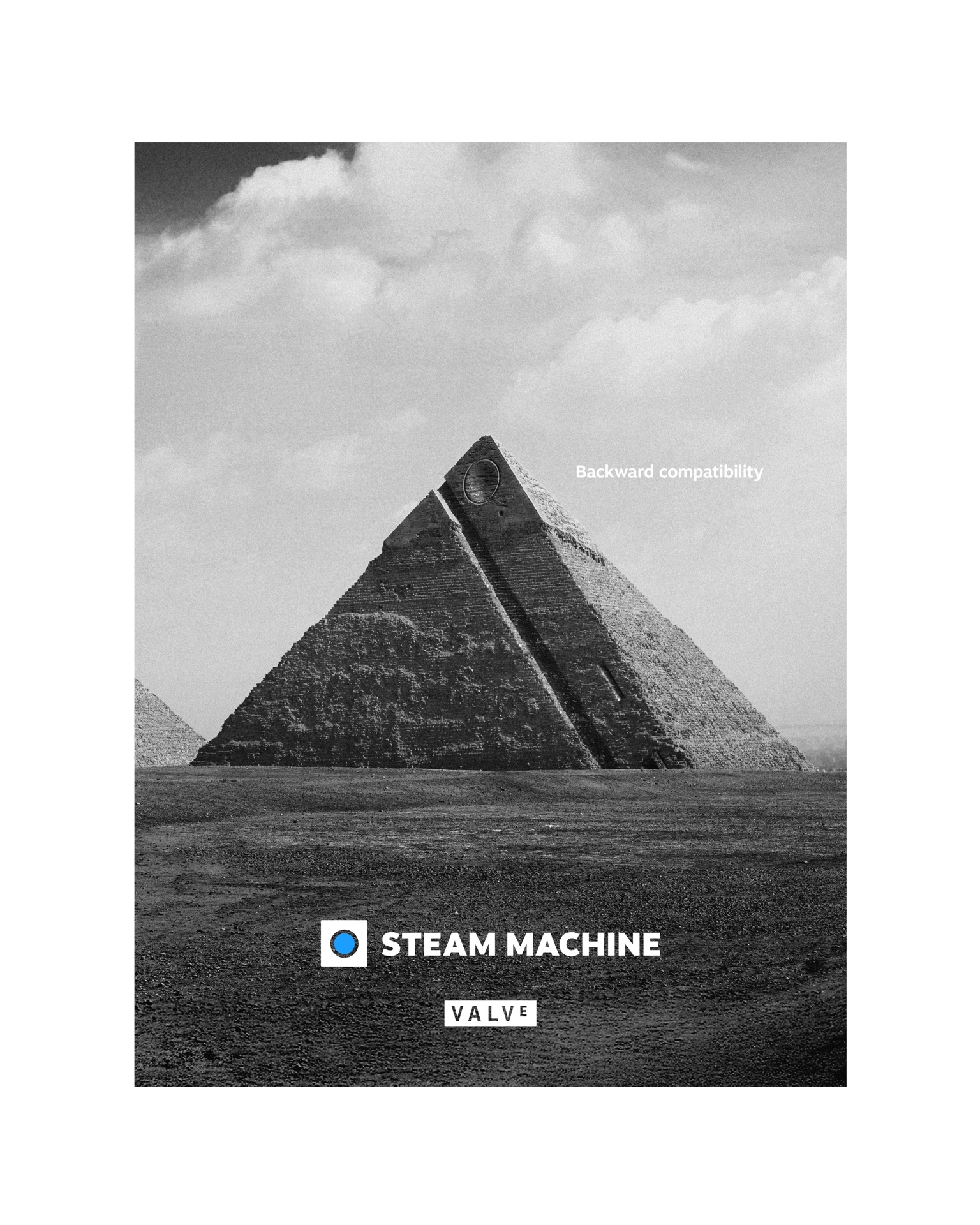 For Steam Machine – the compact gaming PC running SteamOS launching in early 2026 – the design shows Egyptian pyramids with a lightning bolt-shaped zipper and the text "Backward compatibility," emphasizing day-one access to the entire Steam library.