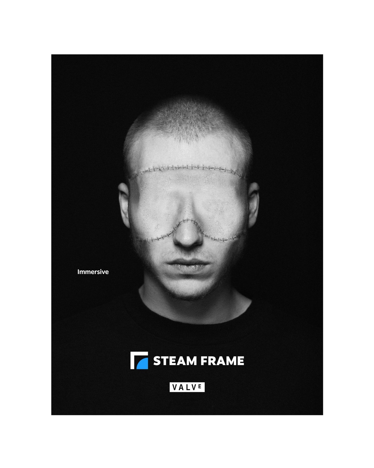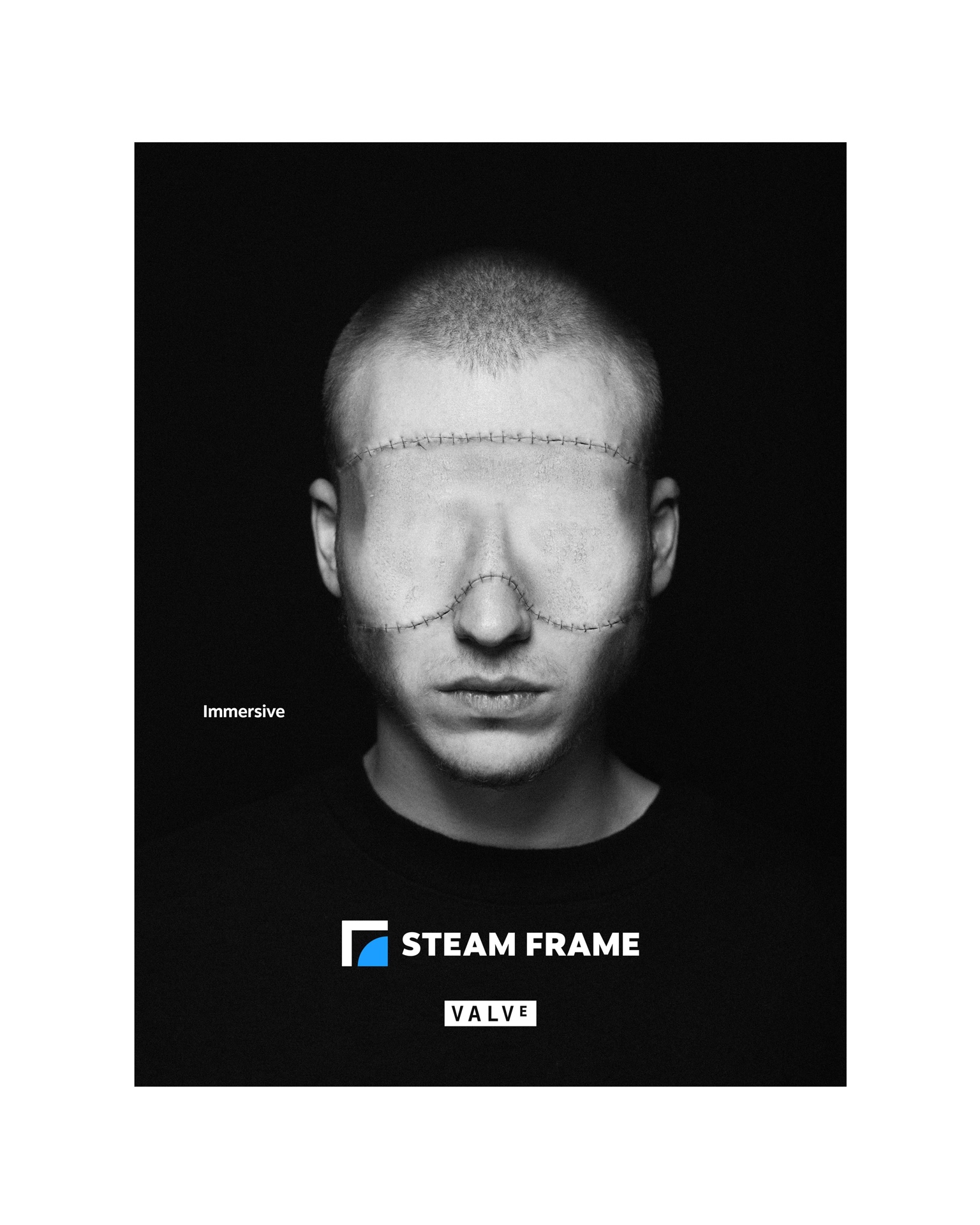 For Steam Frame – the VR headset announced in November 2025 – a poster features a human face with sewn-shut eyes, labeled "Immersive."