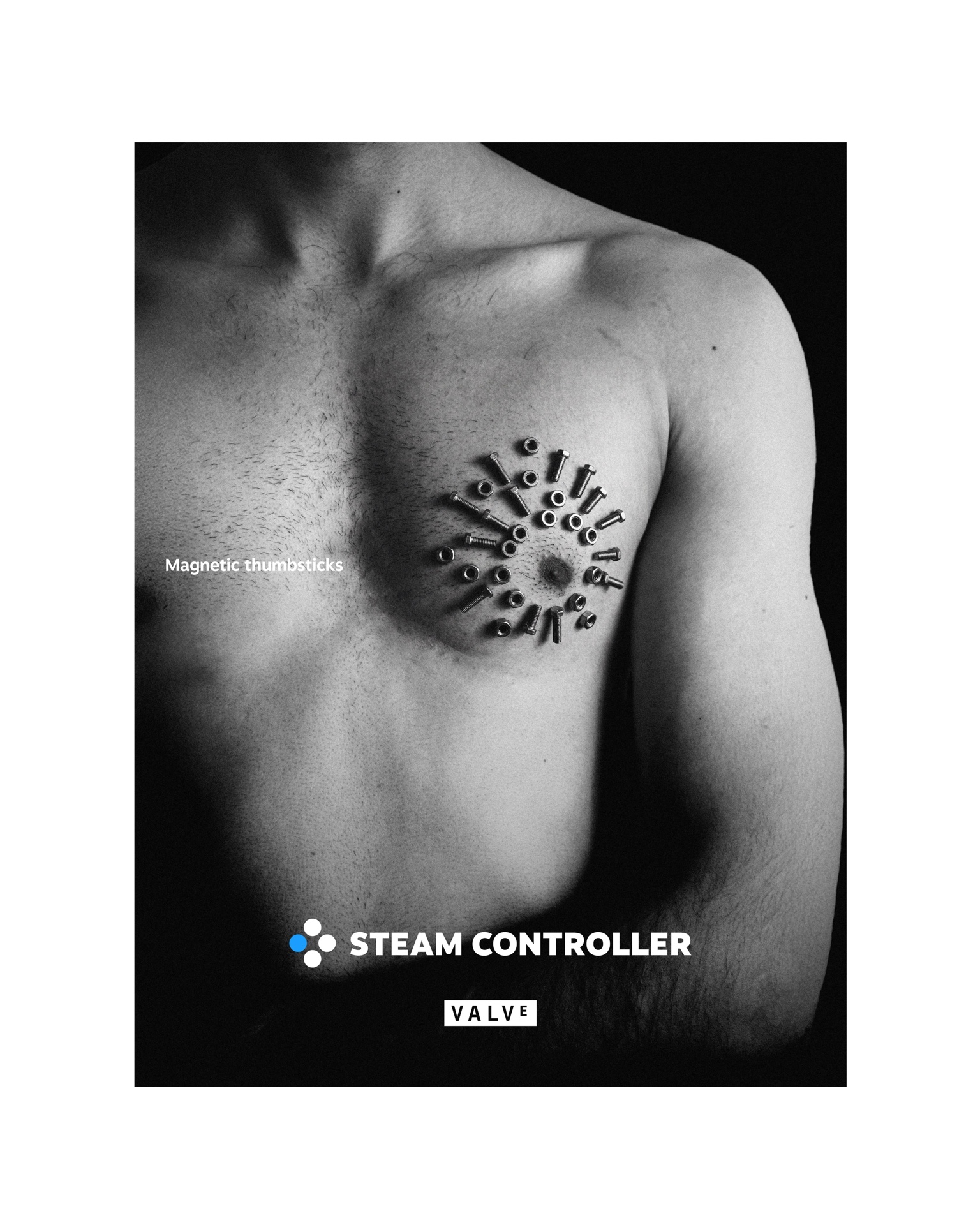 Steam Controller received a poster depicting a human torso with magnetic button-joysticks, illustrating "Magnetic thumbsticks" – the TMR-based magnetic sticks that are the new controller's signature feature.