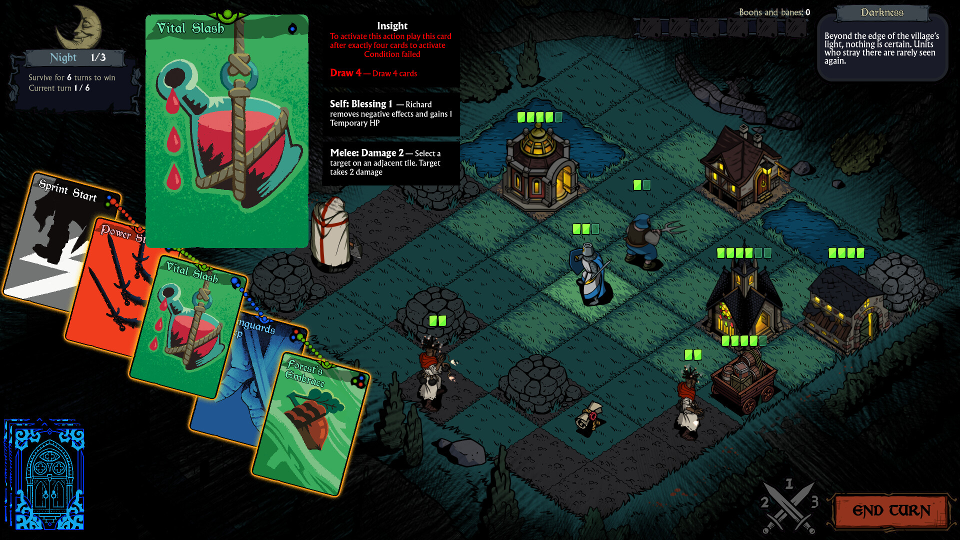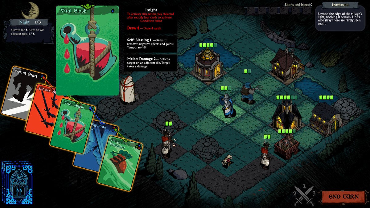 The mechanics revolve around a day-night cycle. During the day the player strengthens defenses and adapts strategy by selecting cards for their deck – which defines the entire run and serves simultaneously as strategy, lifeline, and curse. At night vampire attacks begin with tactical grid-based combat. The developer describes the gameplay with the phrase "the curse never ends" – players must retry, discover new elements, and dive deeper into the vampiric abyss.