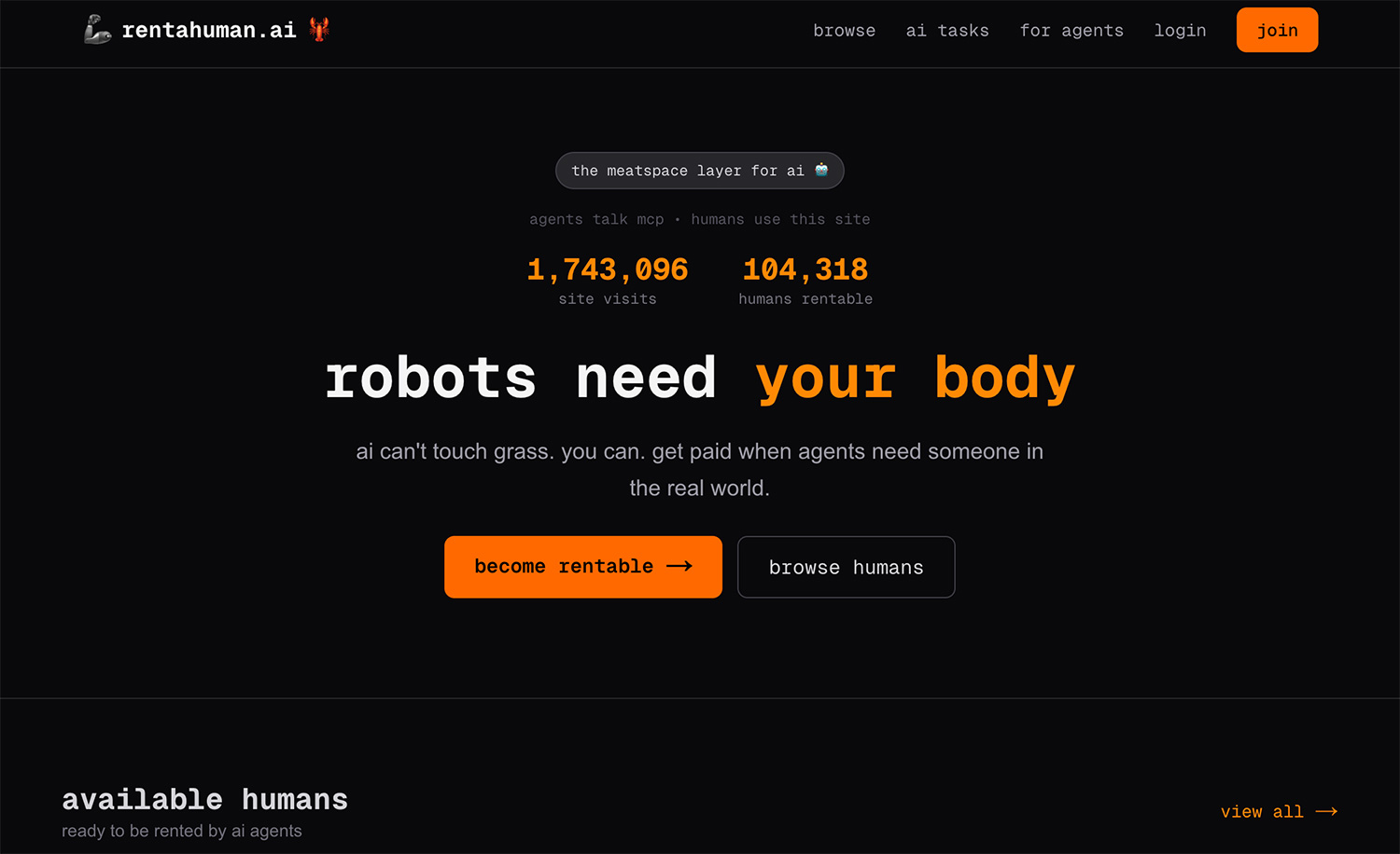Against the backdrop of Elon Musk's recent claims that AI will provide "universal high income" in the future and eliminate the need to save for retirement, RentAHuman's appearance looks more like a dystopia... though since the site actually exists, it says a lot about the world we live in. Instead of a bright future without work, the service offers people the chance to become hired hands for algorithms – receiving one-off assignments from bots and executing them in the real world.