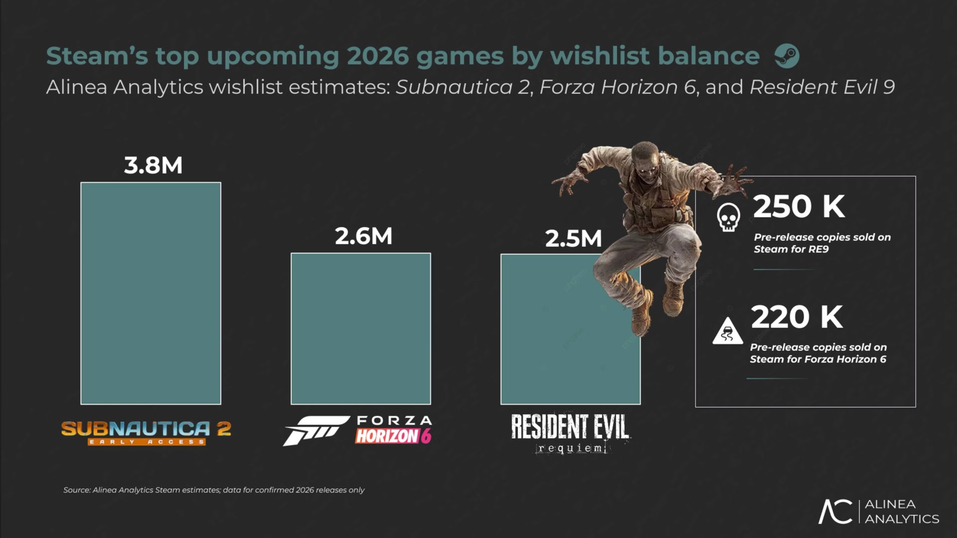 According to data from analytics service Alinea Analytics, Subnautica 2 tops the list of most wishlisted games with a 2026 release date. The sequel has accumulated around 3.8 million wishlist additions – 1.2 million more than Forza Horizon 6, and significantly ahead of Resident Evil Requiem at 2.5 million.