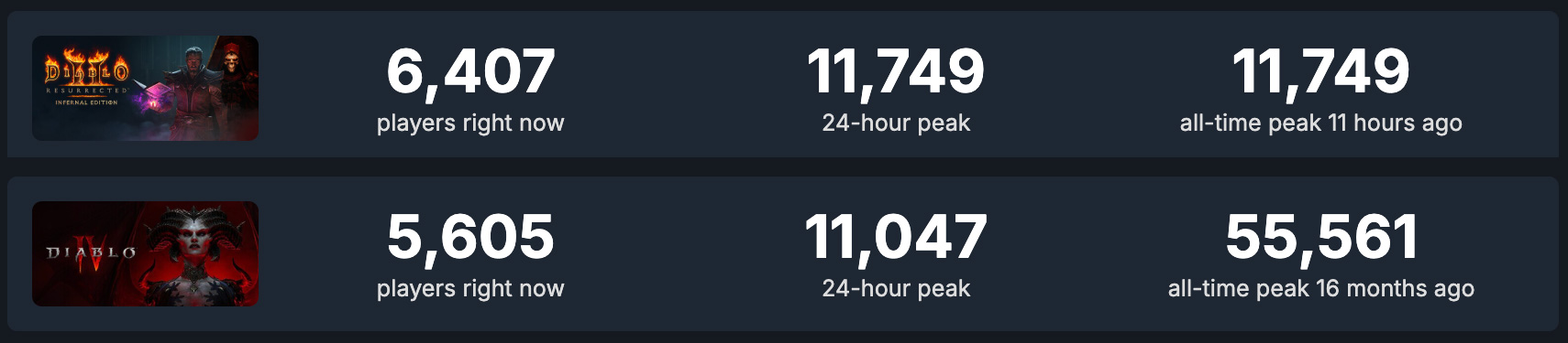 According to Steam DB data, the 24-hour peak for Diablo 2: Resurrected reached 11,749 players, while Diablo 4 hit 11,047. The all-time record for the fourth game remains significantly higher at 55,561 players, but that was set 16 months ago. For the Diablo 2 remaster, the current peak simultaneously became its all-time Steam high.