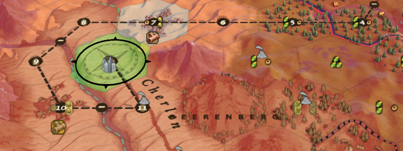 The screenshot shows how the planned route circles around the city in a wide arc through desert tiles instead of simply stepping toward the city on turn 8. Considering that in the early stages each turn takes an enormous amount of in-game years, this maneuver will cost the Settler centuries.