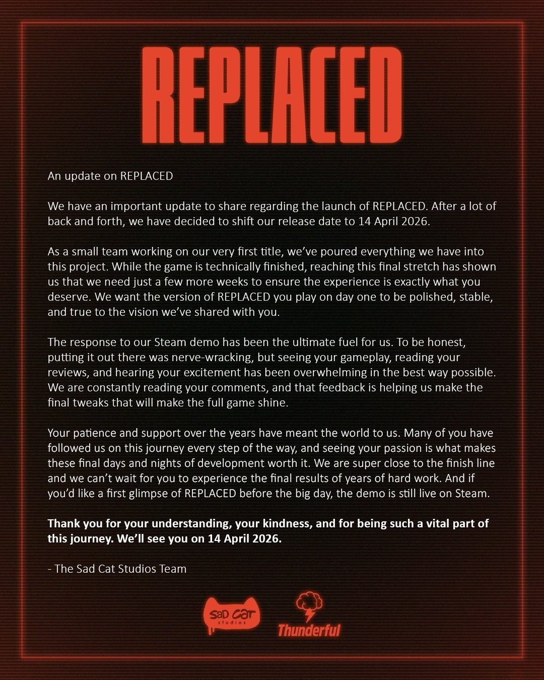 Sad Cat Studios has announced that Replaced has been pushed back from March 12 to April 14, 2026. The team explained the decision came after careful review of the project's final production stage.