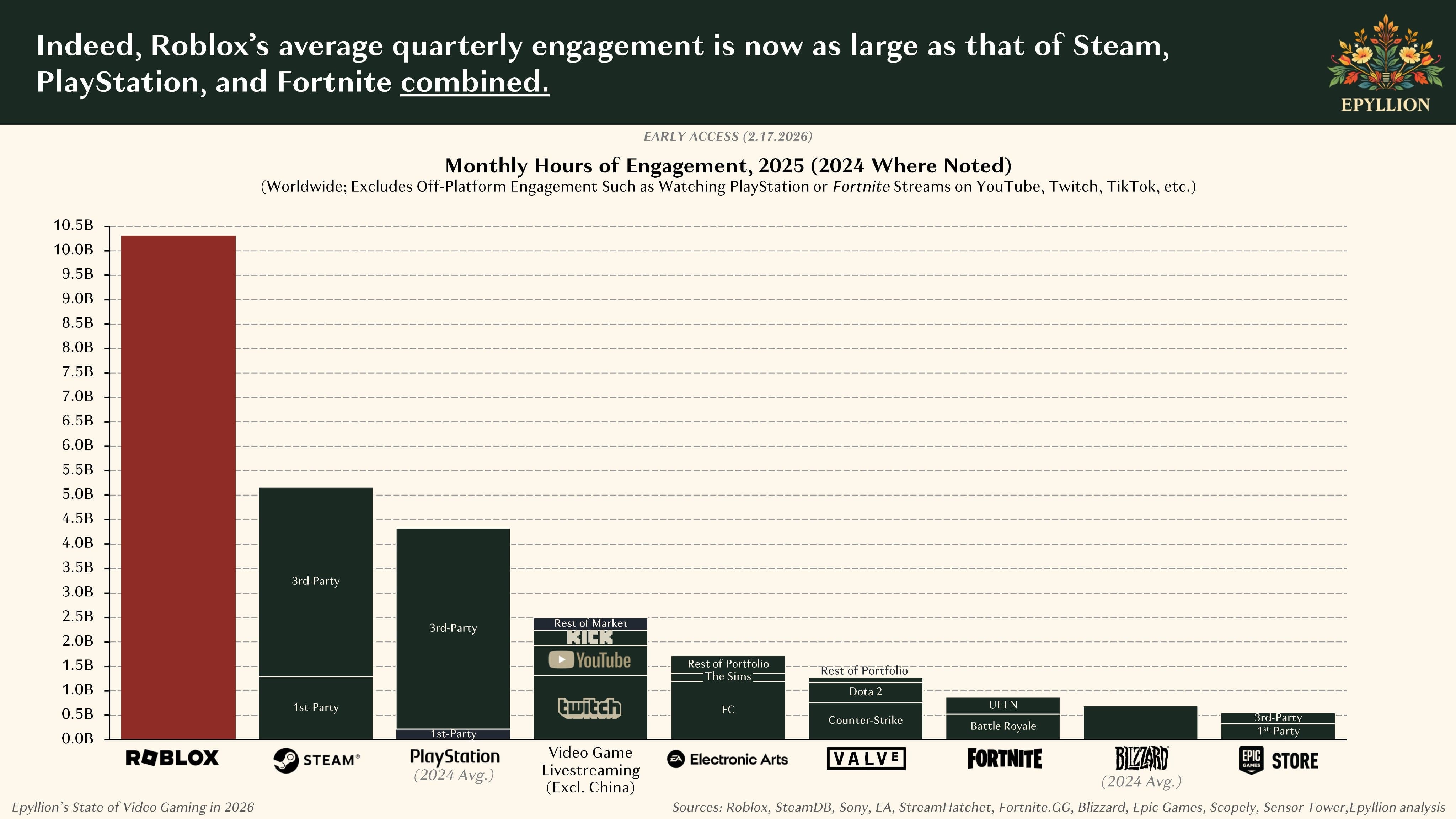 Individual games within Roblox are now competing with some of the biggest standalone titles. Fortnite generates around 0.86 billion average monthly hours of engagement, while Grow a Garden clocked around 0.71 billion hours over 10 months – higher than the combined total for Blizzard Entertainment's entire software lineup, which sits at approximately 0.69 billion hours, according to the report.