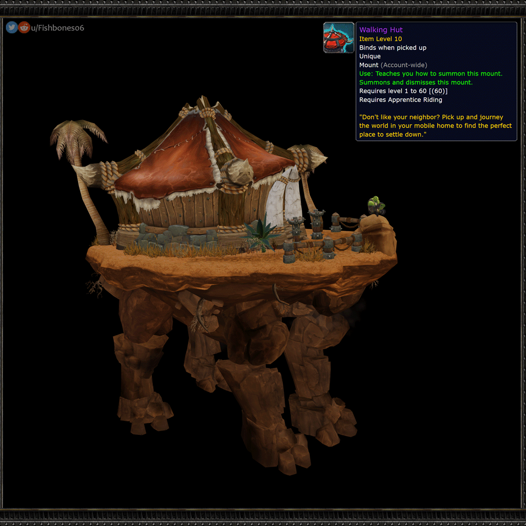 There's also a Horde version called the "Walking Hut," done up in a desert style with a palm tree and totems. Both concepts are presented as proper in-game items with a tooltip that reads: "Don't like your neighbor? Pack up and hit the road in your mobile home to find the perfect place to live."