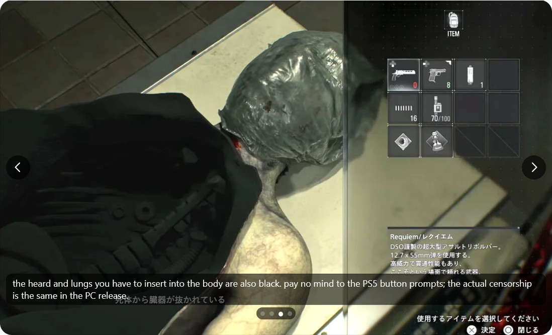 But in Resident Evil Requiem, Capcom went a different route: problematic body parts and internal organs are simply painted over in black – and the coverage is extensive enough to stand out in completely ordinary gameplay moments. One puzzle requires retrieving an artificial heart and lungs from a corpse, and in the Japanese version, the entire upper body and the organs themselves are hidden behind a solid black rectangle.