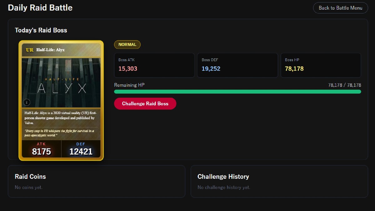 Three battle modes are currently available. Daily Raid pits you against one Raid Boss card per day using up to 10 cards from your collection. Single Random Battle and Team Battle let you go up against real opponents in one-on-one or five-on-five matchups. A Story Mode has been announced but is still in development.